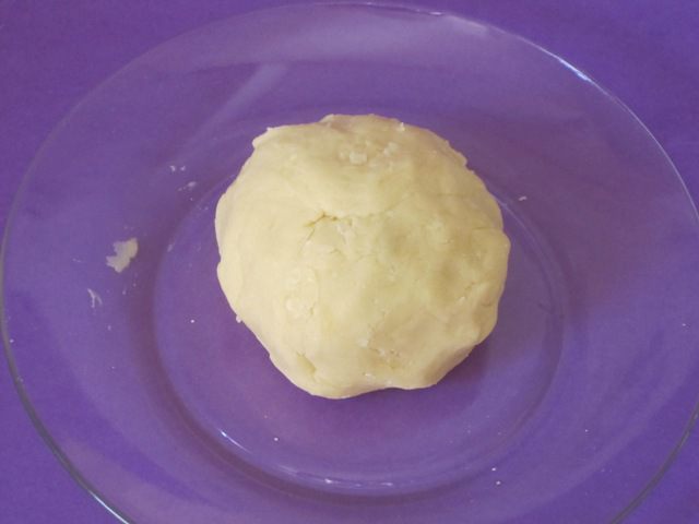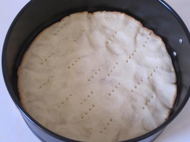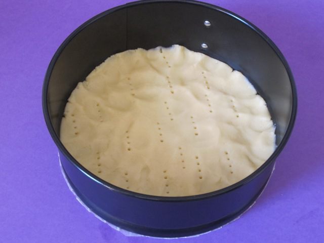 Тесто выложить в форму ( у меня форма диаметром 18 см), растянуть по дну и наколоть вилкой.