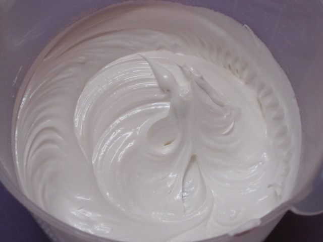 Охлажденные белки и 1 чайную ложку лимонного сока взбить до устойчивых пиков.
