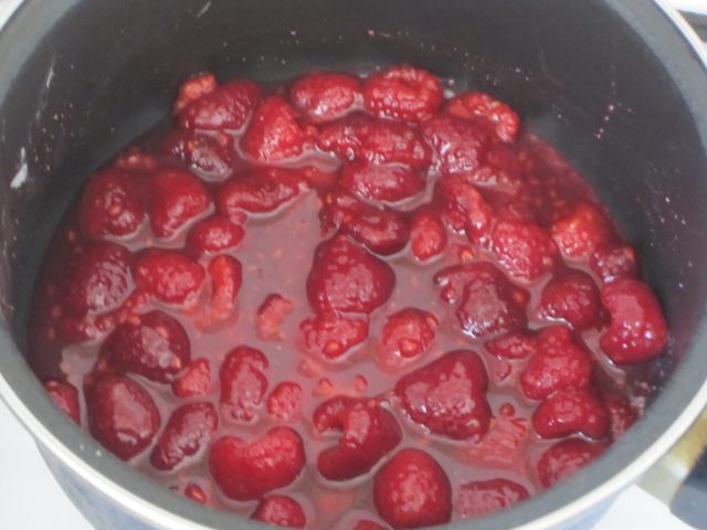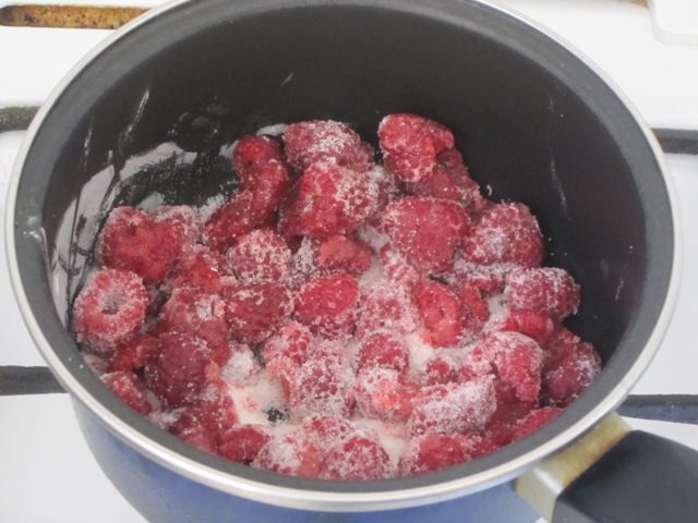 Для соуса в сотейник выложить ягоды малины, сахар, крахмал и ликер.