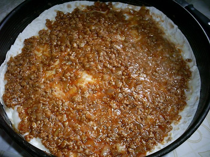 Приступаем к сборке пирога. На дно подходящей по диаметру, смазанной маслом, формы кладем лист лаваша. Смазываем лаваш соусом (примерно 2 ст.л.).