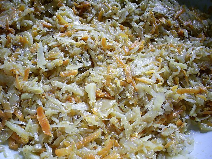 Затем добавляем на сковороду отжатую квашеную капусту, перемешиваем и тушим под закрытой крышкой 20-25 минут на медленном огне. Периодически помешиваем, чтоб не пригорело, если нужно, добавляем соль, сахар по вкусу.