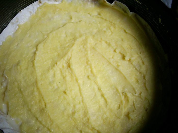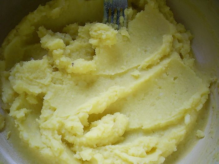 С третей начинкой совсем все просто, если у вас с предыдущей трапезы осталось немного готового пюре. Тогда мы просто смешиваем его с яйцом. Если же вы все готовите сразу, то приготовьте пюре, как вы это обычно делаете, возьмите его необходимое количество и смешайте с яйцом.