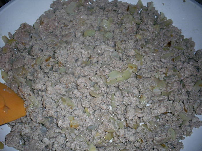 Начнем с приготовления начинок. Мелко нарезанный лук обжариваем на растительном масле до золотистого цвета. К нему добавляем мясной фарш и жарим на среднем огне до готовности мяса.