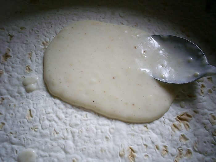 Снимаем сотейник с огня и порциями добавляем к мучной смеси молоко, каждый раз тщательно размешивая до полной однородности массы.