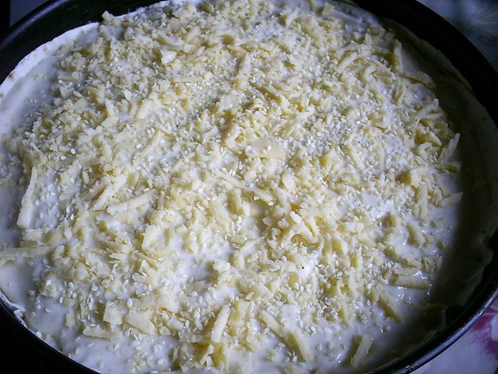 Повторяем все слои еще раз в той же последовательности и таким образом формируем наш пирог. Последним должен быть лист лаваша, смазанный слоем сырного соуса. Посыпаем его тертым сыром и кунжутом и отправляем в разогретую до 180-190 градусов духовку на 35-40 минут. Следите, чтоб сыр не сгорел.