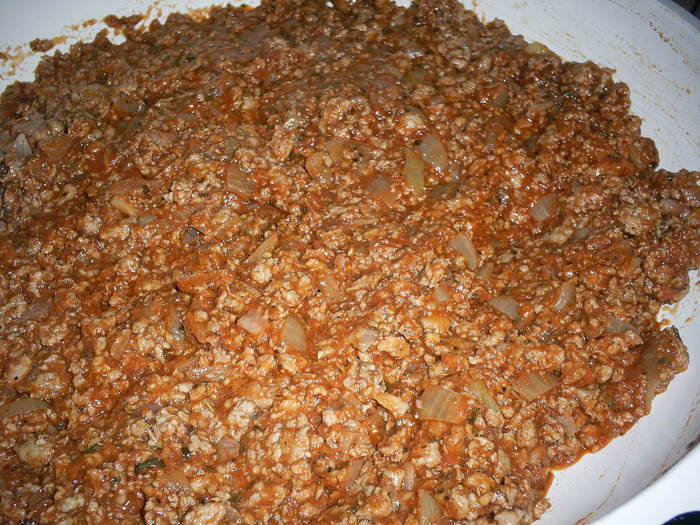 Добавляем томатную пасту и воду к обжаренному фаршу, солим, перчим, добавляем сахар и приправляем по своему вкусу. Тушим на среднем огне минут 10-15, чтоб испарилась лишняя жидкость.