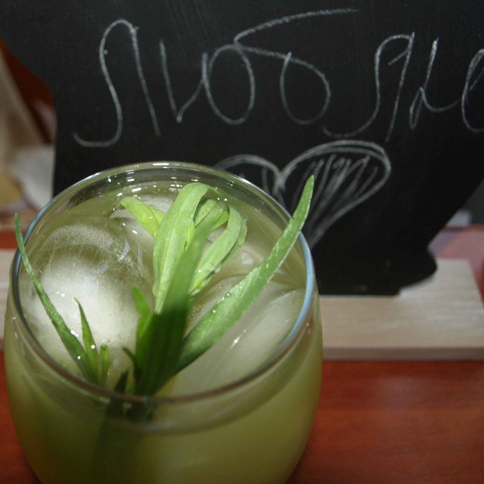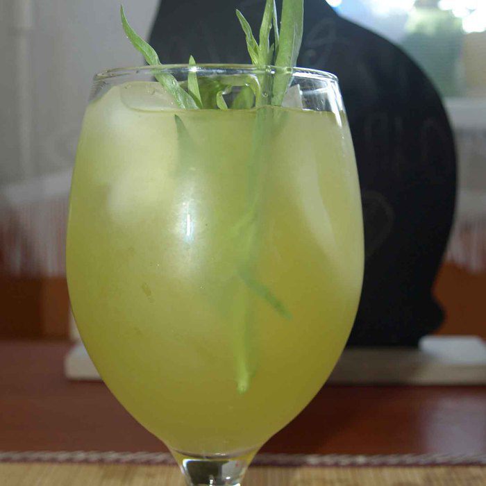 Готовый лимонад процедить. В бокал кладем лед, веточку тархуна, наливаем лимонад.