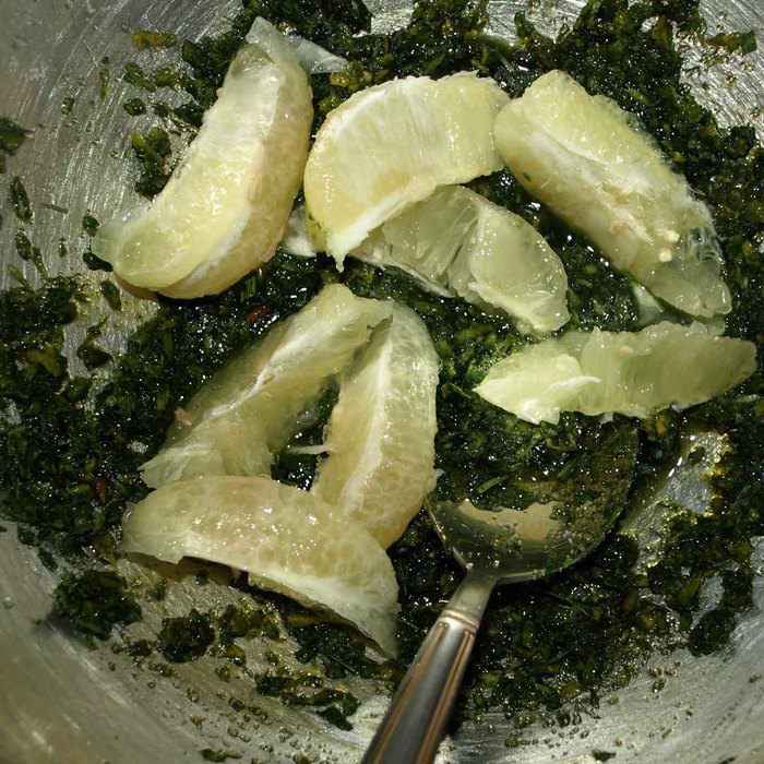 Лимон очистить от кожуры, разобрать на дольки. Соединить с тархуном, из каждой дольки выдавливая сок.