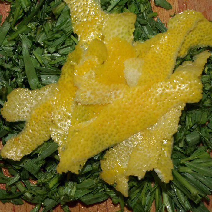 Лимон (большой на 200 грамм) тщательно помыть. Снять цедру. Тархун порубить.