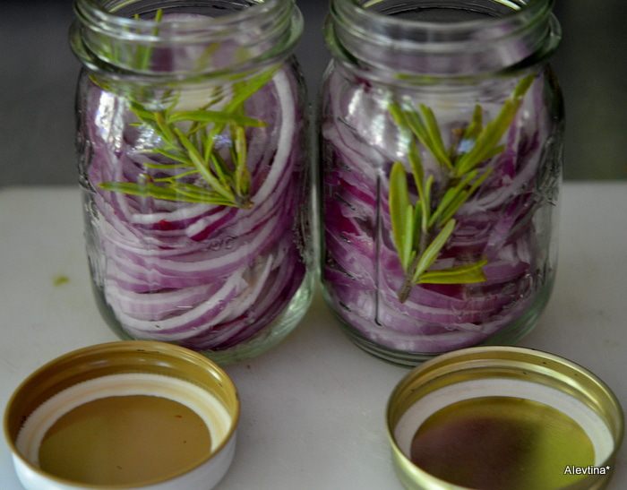 Разложить лук по чистым баночкам после стерилизации, разлить этот маринад, разложить по веточкам розмарина. Закрыть крышкой и поставить в холодильник на 1 день. На следующий день будет готово.