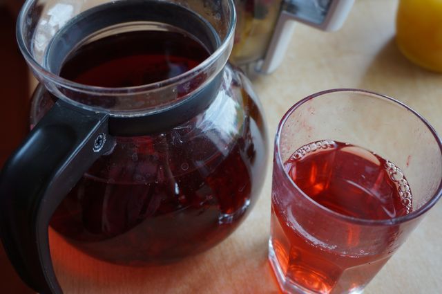 Чай каркаде. Уже заварен. Можно использовать зеленый (отличный антиоксидант), можно обычную столовую воду без газа.