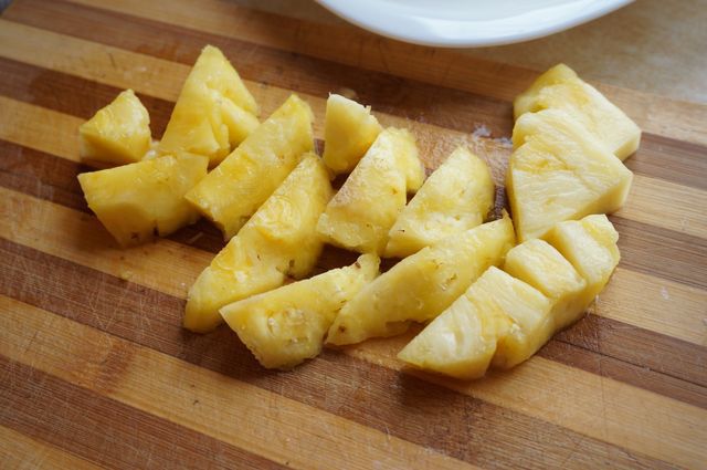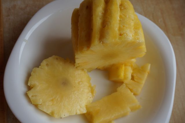 Ананас свежий! Если нет, конечно, можно заменить консервированным, но эффект - не тот ;) Нам нужен 1 стакан уже нарезанного кубиками ананаса. Так получилось, что это половина плода (в моем случае).