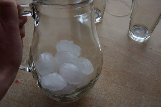 В графин отправляем несколько кубиков льда, выливаем сверху смузи.