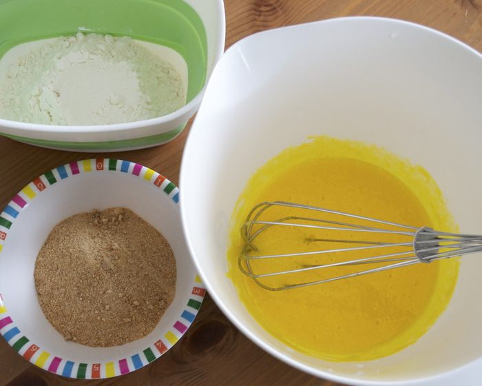 Отдельно растереть желтки с сахаром. Добавить 50 г измельченного печенья и муку.