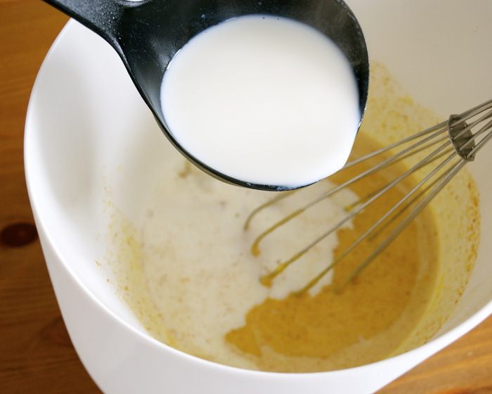 Осторожно влить горячее молоко и размешать, чтобы не было комочков.