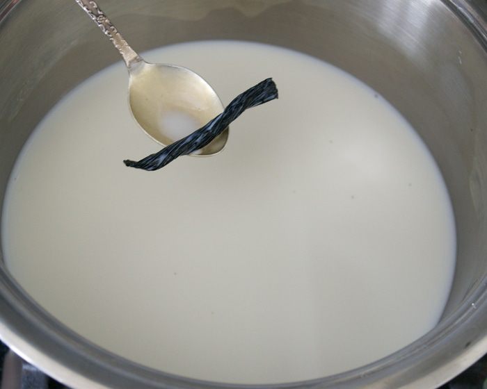 В кастрюльку вылить молоко и поставить закипать вместе с половинкой стручка ванили.
