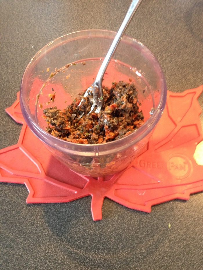 В кухонный комбайн положить вяленые помидоры, оливки, сухари, петрушку и перемешать. Можно все порубить острым ножом. Посолить, поперчить по вкусу. Диетический вариант: вместо сухарей можно положить отруби.