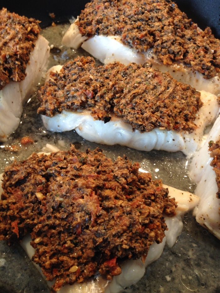 Треска в корочке из оливок и вяленых помидоров (merluzzo in crosta)