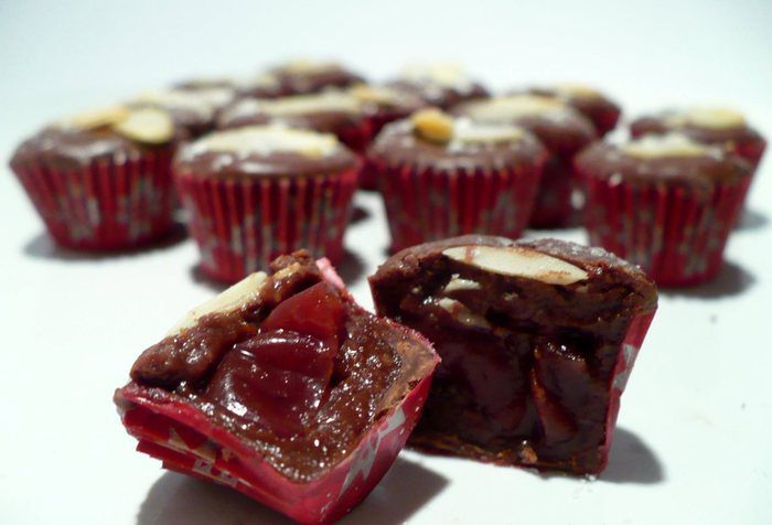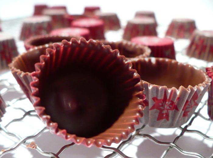 С помощью шприца или кулинарного конуса заполняем дно конфет кремом, выкладываем по две половинки пьяной вишни в крем, оставшееся пространство заполняем кремом. Внимание: заполняем не до краёв! Даём поверхности разровняться.