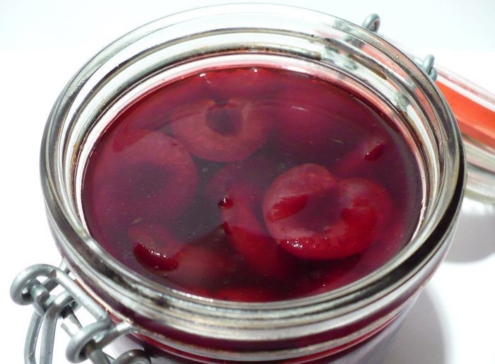 Вишни достаём их амаретто, даём стечь лишней жидкости. Режем вишни пополам. Параллельно растапливаем следующие 100 г шоколада, вводим сливочное масло, затем амаретто, затем сахарную пудру и миндальную муку.