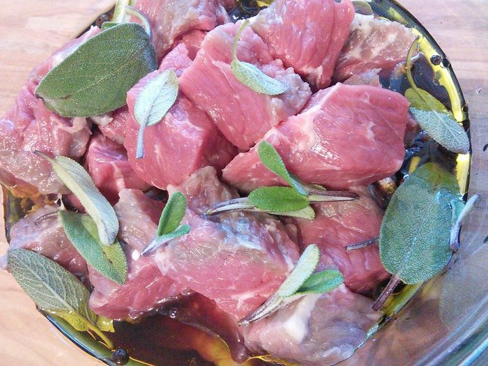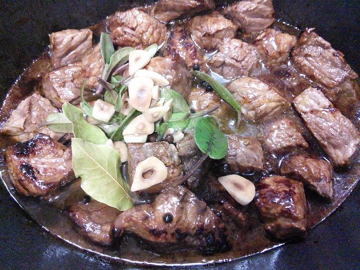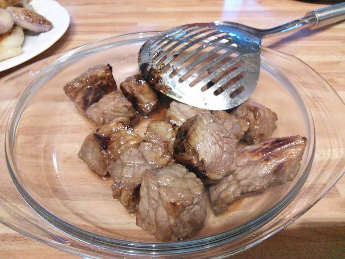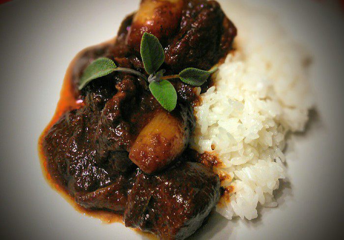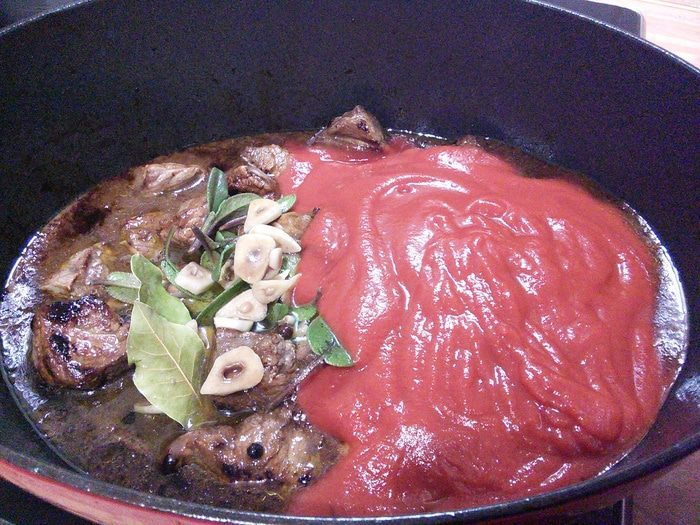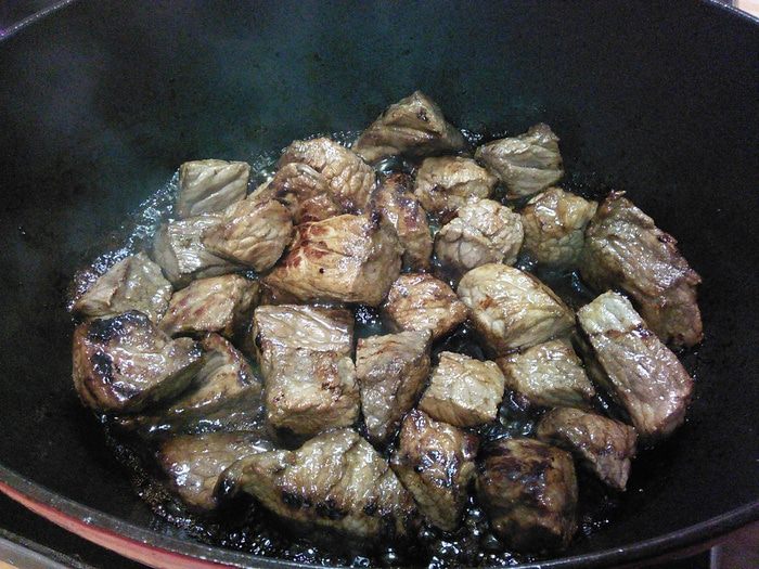 Размешать, довести до кипения, уменьшить огонь и тушить на маленьком огне под крышкой 30 минут, затем выложить луковички и тушить 1,5 часа до готовности мяса. Регулярно проверять, чтобы соус не подгорел. В конце проверить на соль, перец и добавить щепотку сахара.