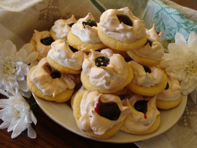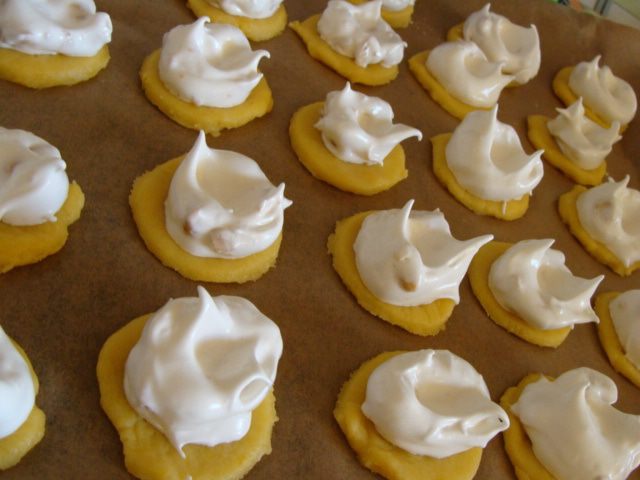 Выложить белково-ореховую массу на песочное тесто, сделав небольшие углубления в середине.