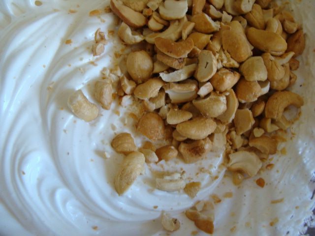 Белки взбить в до острых пик с сахаром и лимонной кислотой. Добавить рубленные орехи.