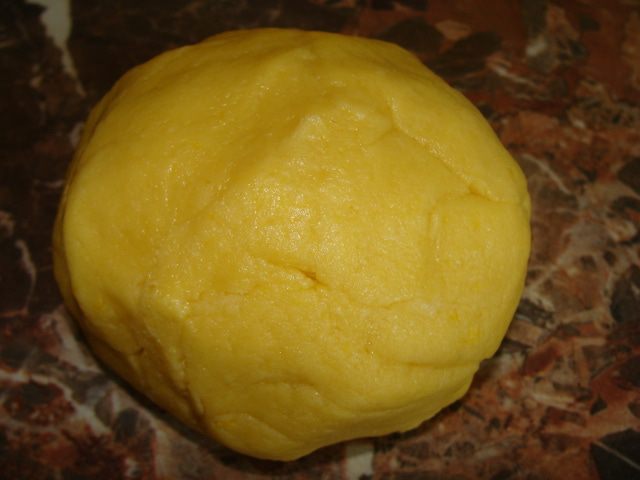 Приготовим песочное тесто. Маргарин растереть с сахаром, добавить желтки, всыпать муку. Замесить тесто и отправить в холодильник на 30 мин.