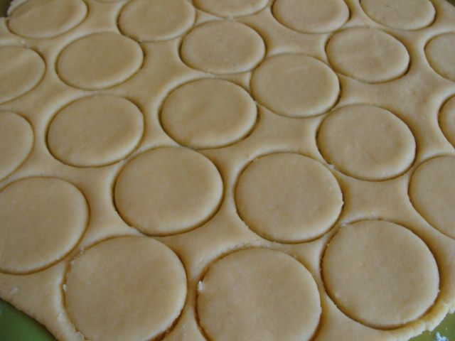 Тесто раскатать. Вырезать круги диаметром 5 см. Противень застелить бумагой. Выложить песочные тарелочки.