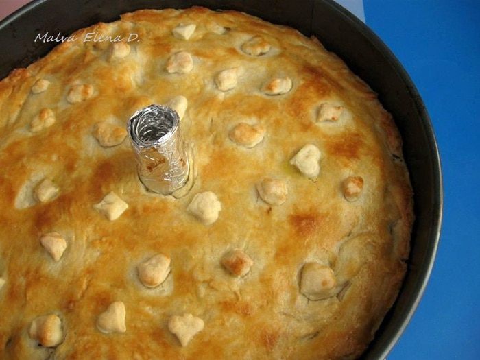 Накрыть верхним кругом теста, соединить края верхнего и нижнего слоя теста. Украсить фигурками из теста. В центре верхнего слоя сделать круглое отверстие. С помощью фольги, скрученной в трубочку, сделать приспособление для отвода пара в центре пирога.