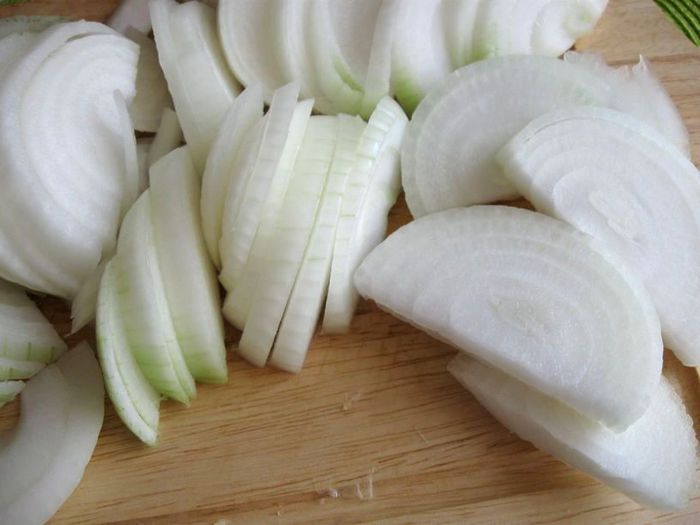 Приготовить начинку. Лук почистить (у меня был достаточно крупный лук), порезать полукольцами. Колбасу почистить, порезать кружочками.