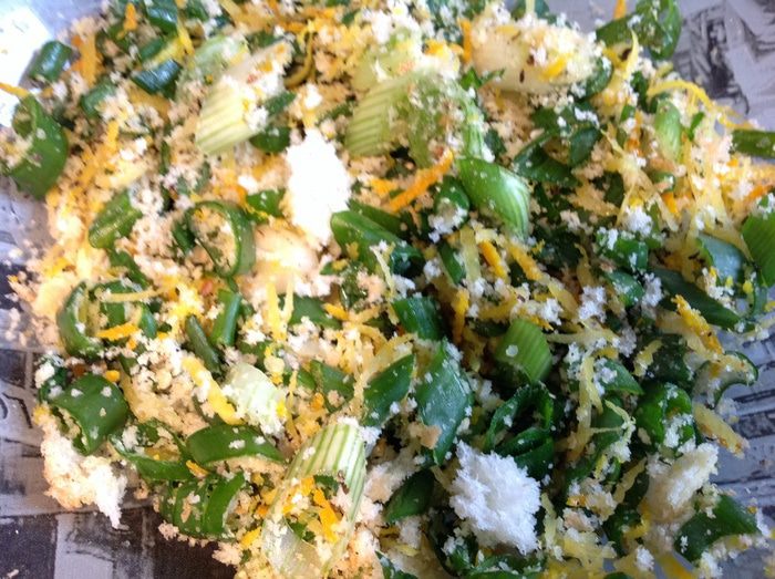 Смешайте цедру лимона, апельсина, лук, хлебные крошки, соль и перец.