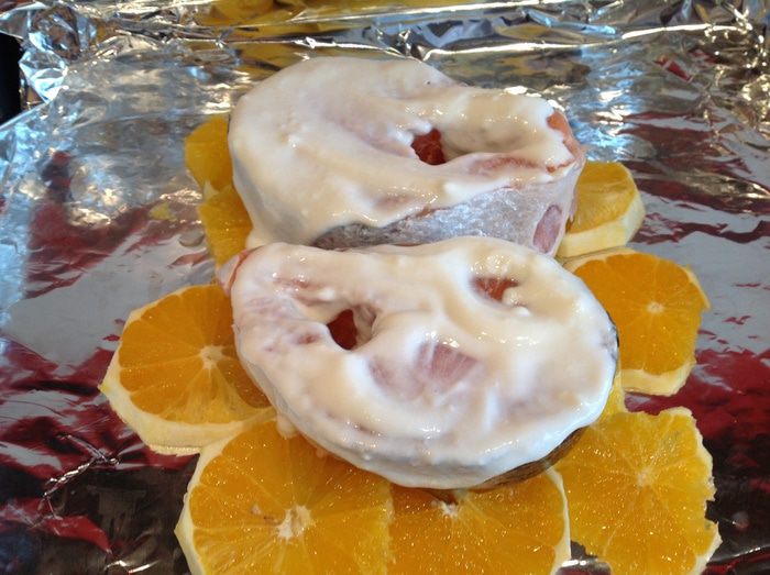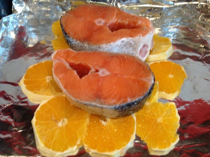 Выложите рыбу на апельсины, посолите.
