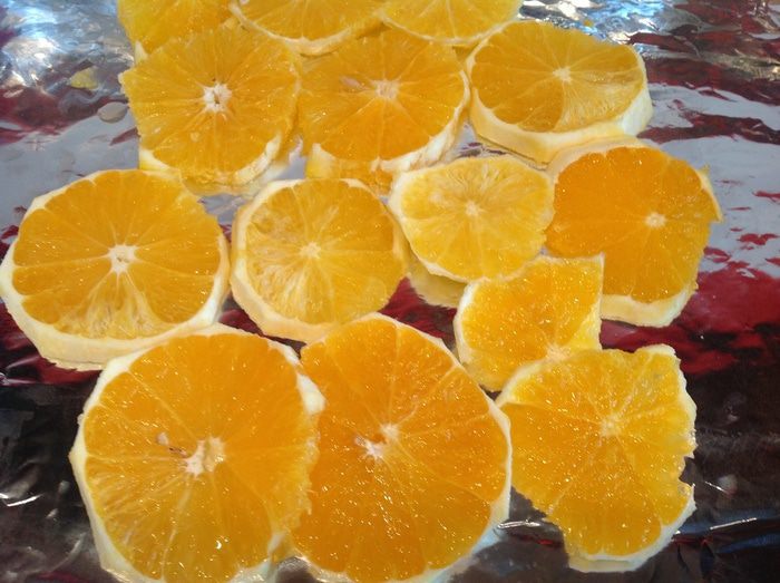 Очистите апельсины, нарежьте кружочками, выложите на противень застеленный фольгой.