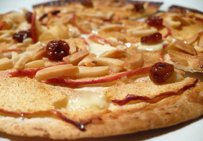 Достать из духовки, разрезать каждый фламмкухен на 4 части и ещё посыпать сахаром с корицей.