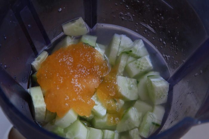 В чашу блендера нарезаем кубиком огурцы, добавляем половину воды и медово-лимонную смесь.