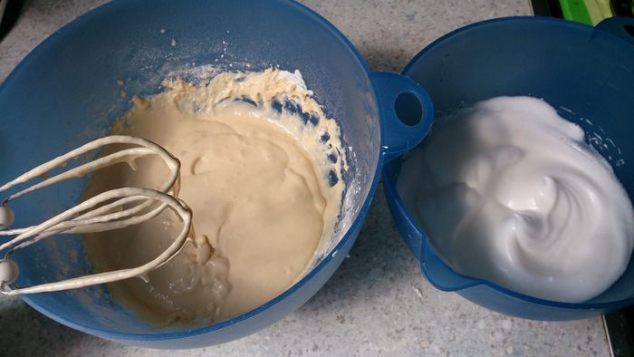 перемешать до однородного состояния. Два белка взбить со щепоткой соли, добавляя при этом сахар. Взбитые белки осторожно венчиком добавить к