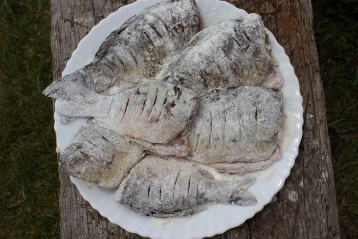 Смешать муку, соль и перец. Обвалять в этой смеси рыбу снаружи и слегка посыпать изнутри. Оставить на 5 минут.