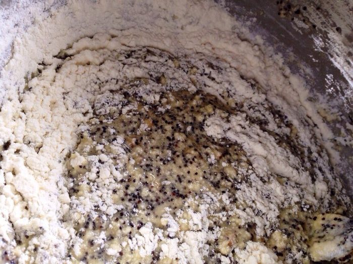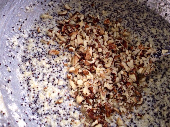 Мак хорошо отжать,чтобы избавиться от излишка молока.И добавить в масляно-яичную смесь.Туда же добавить рубленные орехи. Все хорошо перемешать.