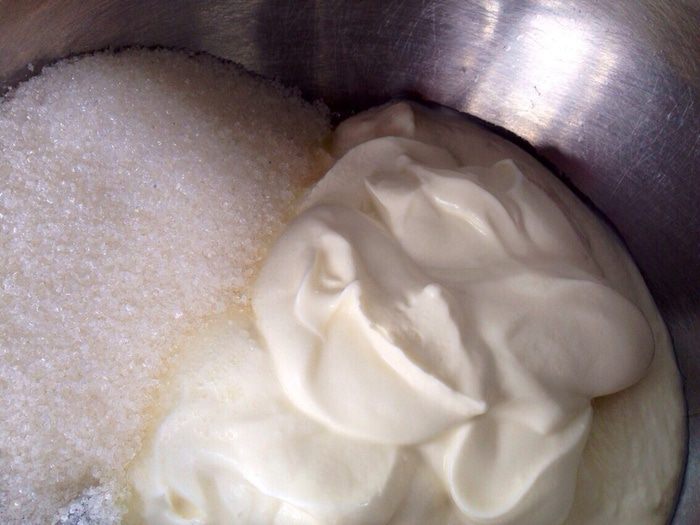 Сметану смешать с сахаром и ванильным сахаром.