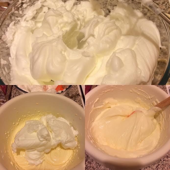 Белки взбить до устойчивых пиков (5-10 минут). Добавить белки в желтково-сырную массу. И аккуратно перемешать снизу в верх.
