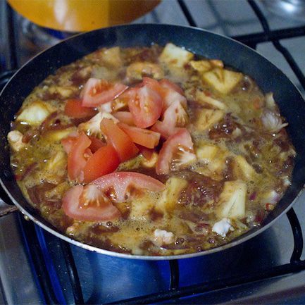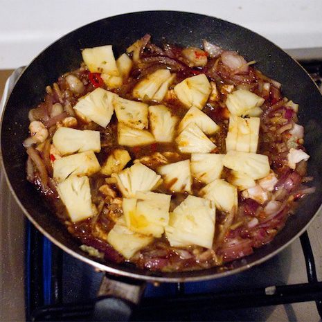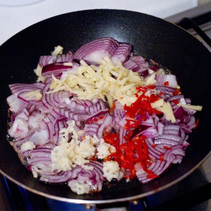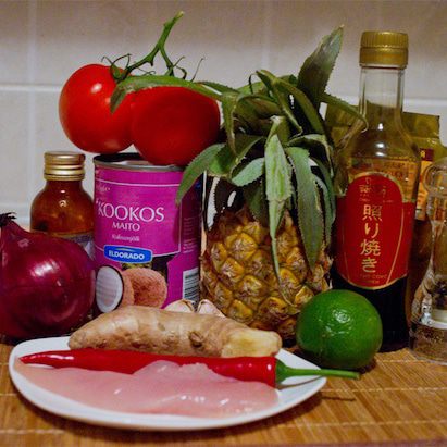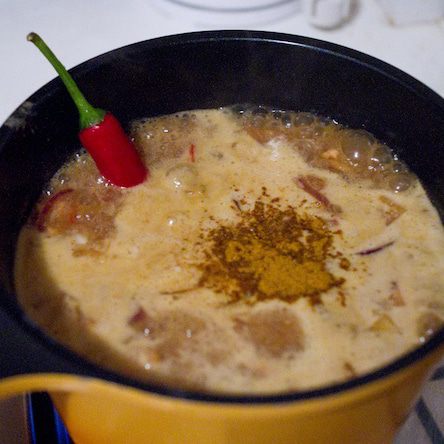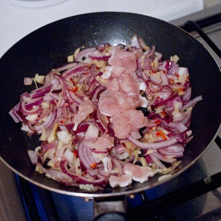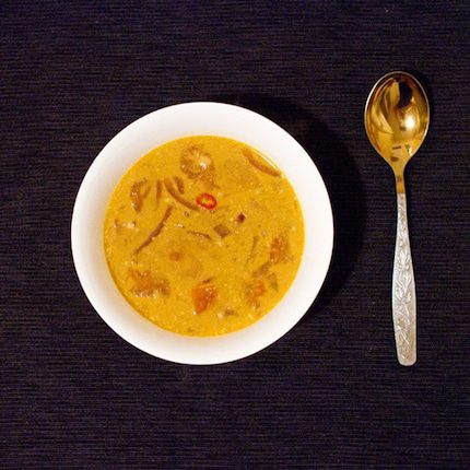 В закипающее кокосовое молоко вливаем нашу смесь из курицы и овощей. Мне не хватило остроты, поэтому в уже кипящий супчик я положила оставшуюся половинку перчика чили, буквально на пять минут и сразу вынула. Чили очень коварный, есть большая опасность переборщить и испортить блюдо.