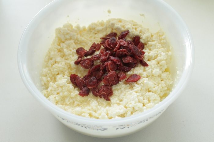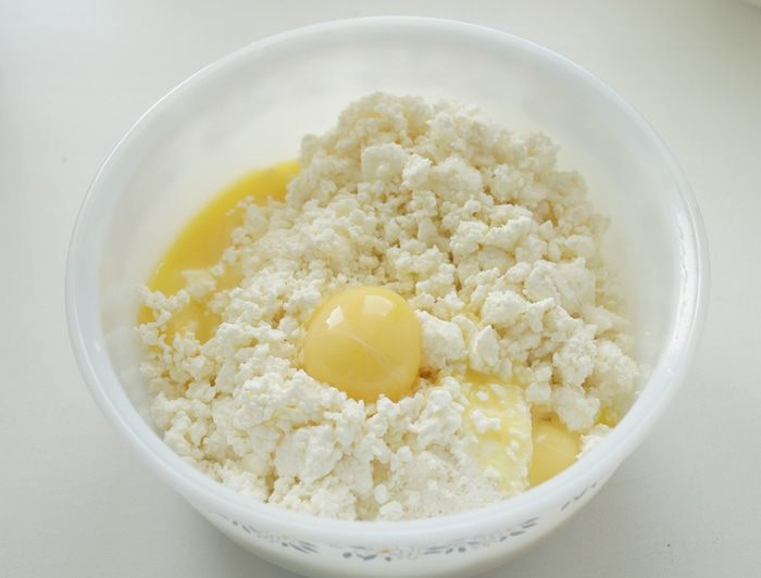 Смешать творог, сахар, желтки.