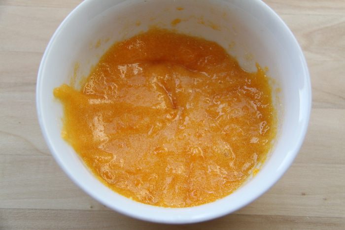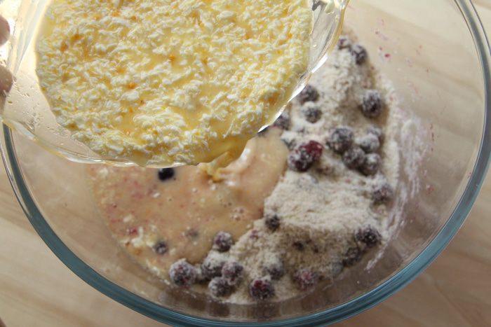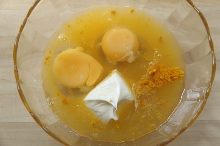 Соединить яйца, апельсиновый и лимонный соки, цедру и масло. Взбить слегка венчиком.