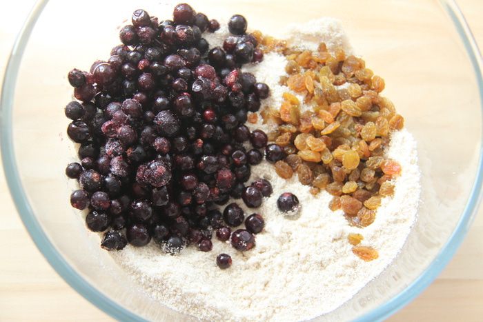 К мучной смеси добавить изюм и чёрную смородину (если замороженная, то не размораживать).