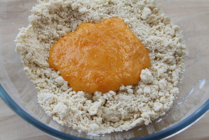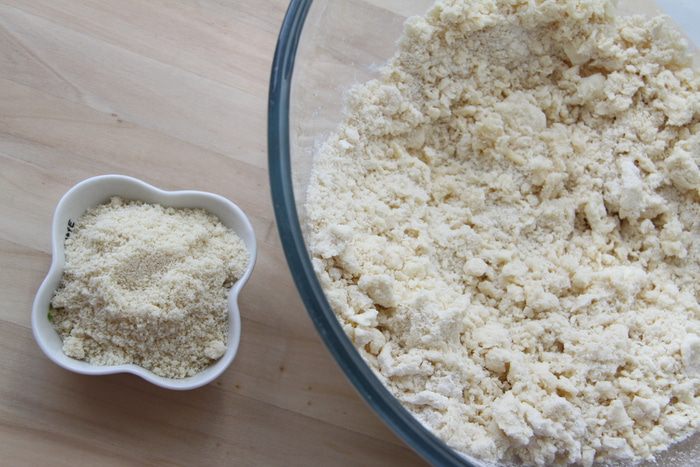 К сливочной крошке добавить миндальную муку (или измельчённый миндаль).