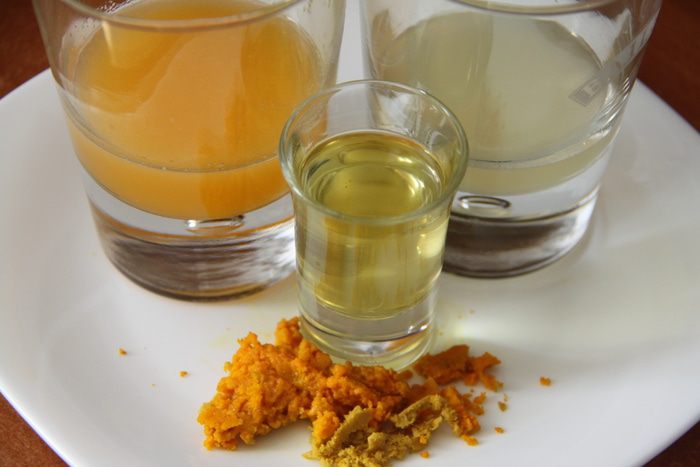 Приступим к приготовлению начинки. Натереть цедру с лимона и апельсина, выжать лимонный и апельсиновый сок. От себя (в оригинальном рецепте этого нет) добавила рюмочку самодельного апельсинового ликёра.