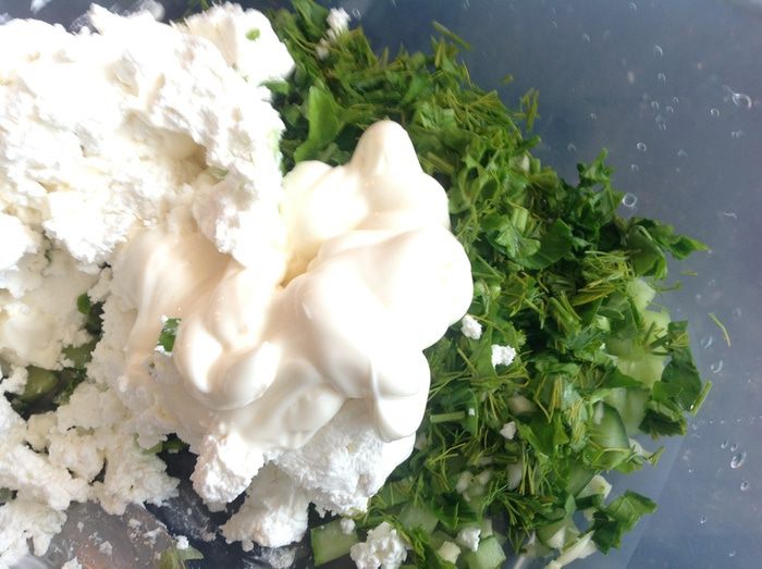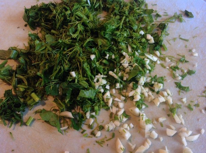 Мелко порубить зелень и чеснок. Если любите поострее добавьте побольше чеснока.