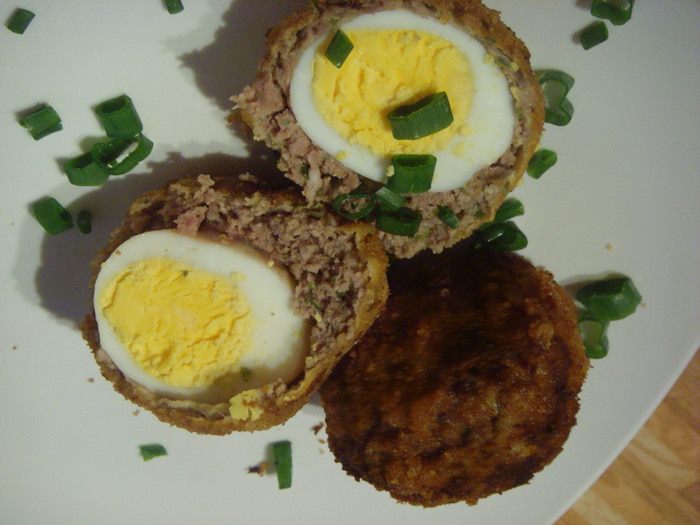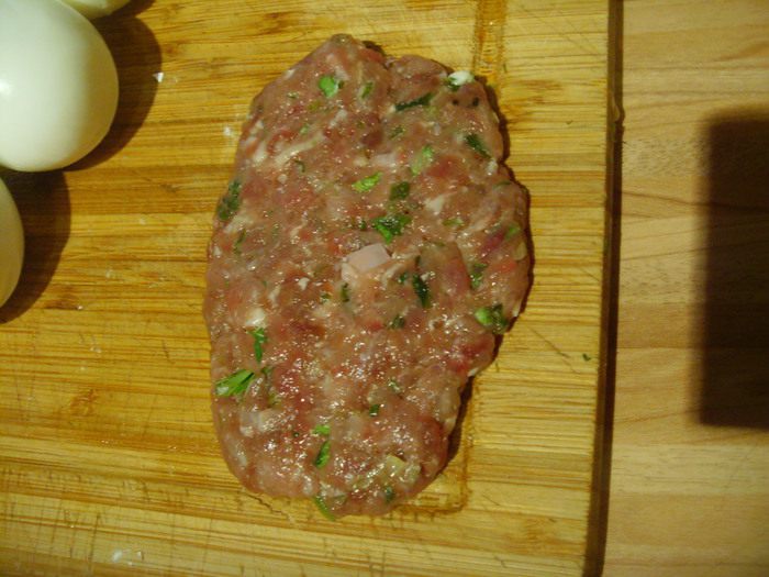 Облепить фаршем, постараться, чтоб фарш обхватил яйцо равномерно со всех сторон. Обвалять в муке, взбитом яйце.