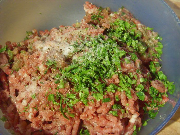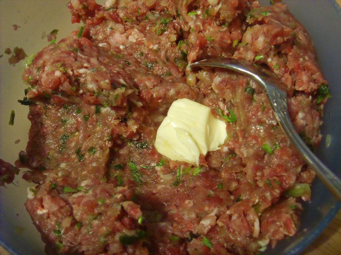 Фарш у меня из говядины и индюшатины. Мясо постное, поэтому я вмешала ещё размягчённое сливочное масло. Итак: фарш смешать с мелко порубленной зеленью петрушки и зелёным луком,